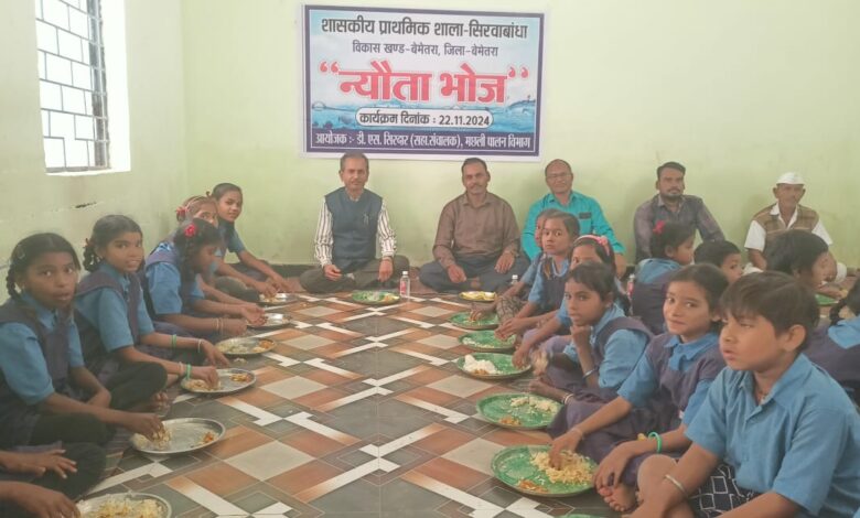 इसी क्रम मे आज न्यौता भोज का आयोजन शासकीय पूर्व माध्यमिक विद्यालय सिरवाबांधा में कार्यपालन अभियंता जल संसाधन विभाग के सी एस शिवहरे एवं शासकीय प्राथमिक विद्यालय सिरवाबांधा में सहायक संचालक डी एस सिरदार द्वारा किया गया। उपरोक्त कार्यक्रम में जिला मिशन समन्वयक नरेंद्र वर्मा, बीईओ अरुण खरे, बीआरसीसी राजेंद्र साहू उपस्थित थे |