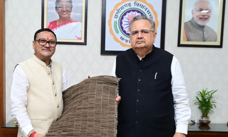 रायपुर। विधानसभा अध्यक्ष डॉ. रमन सिंह से मनोहर गौशाला के ट्रस्टी डॉ. अखिल जैन ने मुलाकात की। इस दौरान उन्हाेंने विधानसभा अध्यक्ष को गोबर से बनी चटाई भेंट की।