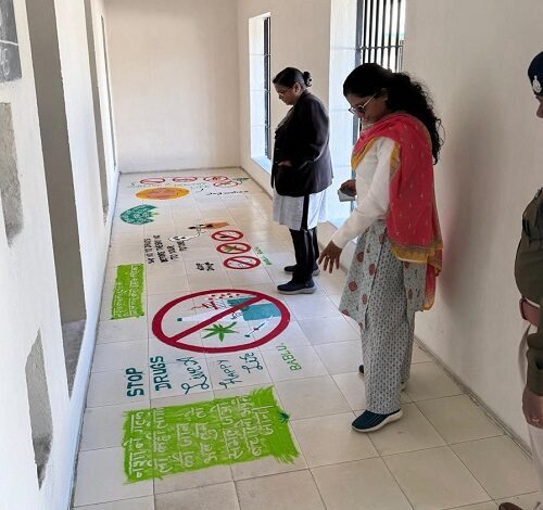 नशा मुक्ति अभियान : रंगोली के माध्यम से नशे से होने वाले दुष्प्रभावों के संबंध में दिया गया संदेश